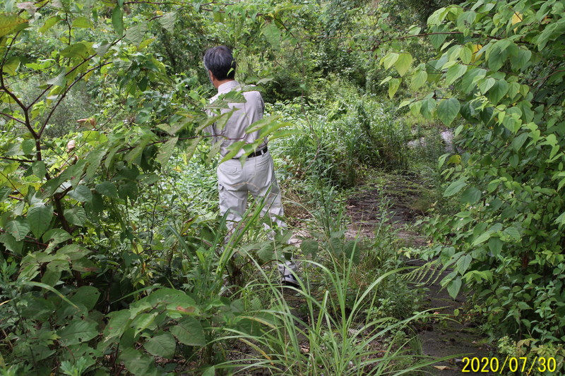 残土を埋める予定地の一番上流側は道の駅のすぐ下です。以前は道の駅から予定地の下の方まで見とおすことができました。地権者の手を離れ手入れをしないので樹木やつる草が茂って下のほうは見えません。下の谷に降りていく狭い道路(補足)があったのですが、その入口も草木が覆っていてわからないくらいでした。これから何年この状態が続くのか…。