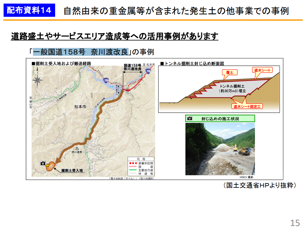 JR東海は、長野県駅工事で要対策土を活用する計画についての、2024年2月28日の住民説明で「ヒジキにもヒ素は入っているよ」という説明のあとで、基準値を超える重金属等が入った残土の「道路盛土やサービスエリア造成等への活用事例があります」として「一般国道158号 奈川渡改良」をあげていますというか、そう誤解をしそうな説明をしました。下の画像が説明に使ったスライド。