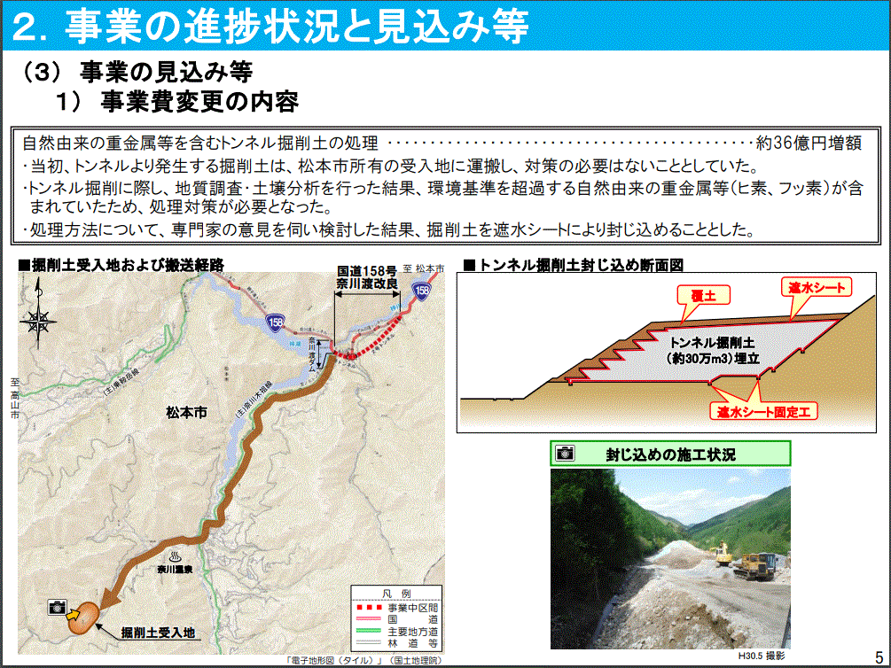 (2025/09/18 補足) JR東海がコピペした土捨て場の盛り土の断面に「30万㎥」と書いてあります。長野国道事務所の「一般国道158号 奈川渡改良」によれば、「奈川渡改良は、国道158号の松本市奈川から同市安曇に至る延長2.2kmのバイパス事業」。ほぼ全線がトンネルなので、仮に半径5.7mの円形の穴を掘るとすると、掘削する断面積は102㎡。2200mに102㎡をかけると224400㎥。地山が硬い岩だとして、締め固めて埋め立て処分するとすれば、1.4をかけると、314160㎥≒約30万㎥。ということは、奈川2号トンネル(大白川トンネル)やその他の工事残土すべてが要対策土だったか、要対策土が見つかったので、全部の残土を要対策土とみなして処分したのか。どうなのでしょうか?