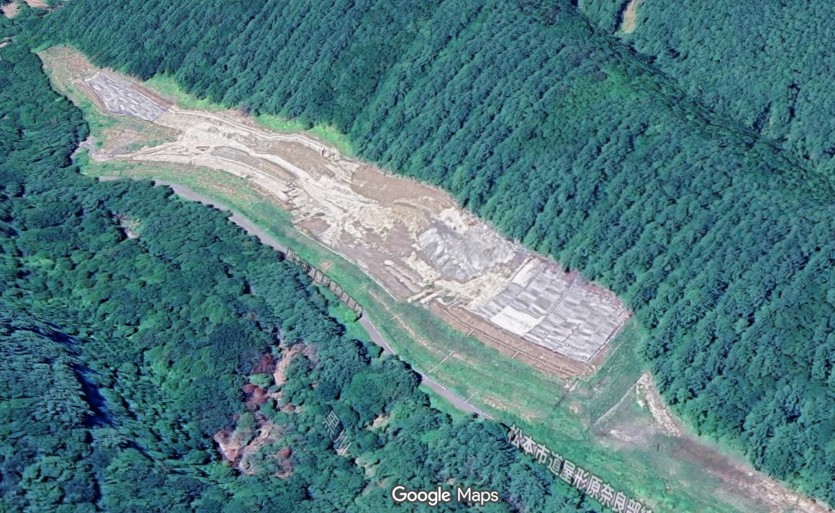 さて、JR東海は「道路盛土やサービスエリア造成等への活用事例があります」と説明しているんですが、「一般国道158号 奈川渡改良」の事例というのは、図面に「掘削土受入地」とある場所、できた土地はどんな有効活用ができているのか調べてみました。現地に行ったわけじゃないですが…。